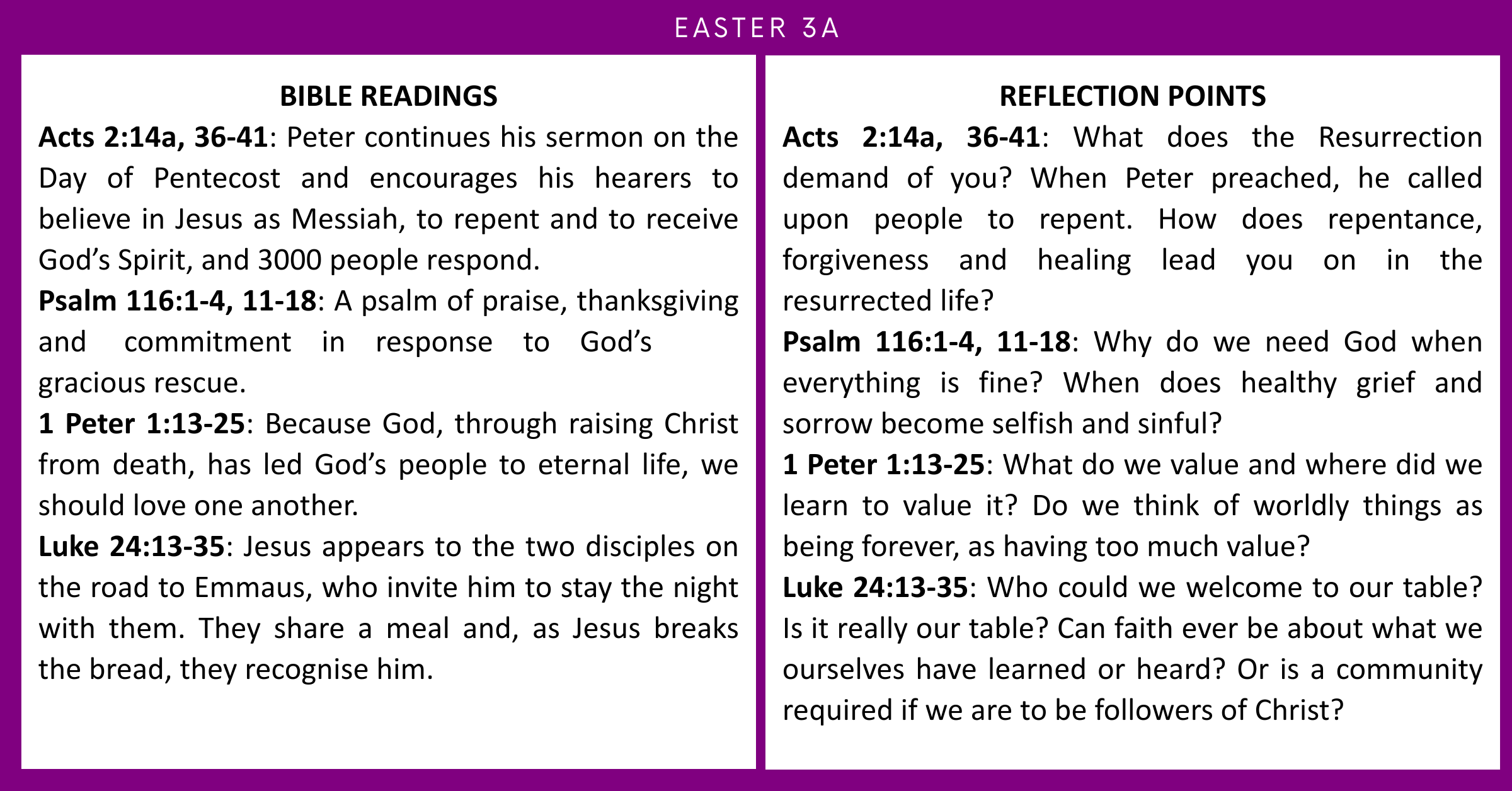 Acts 2:14a,36-41 | Ps 116:1-4, 11-18 | 1 Pet 1:13-25 | Luke 24:13-35