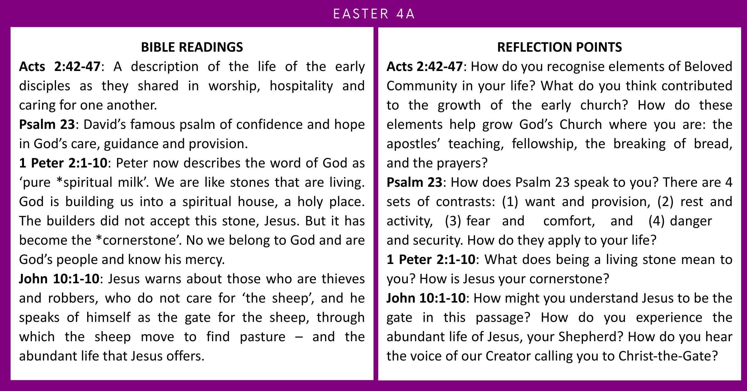Easter4A 26 Apr Written By Tania Eichler Bible Readings and Reflections Acts 2:42-47 | Ps 23 | 1 Pet 2:1-10 | John 10:1-10Sunday 26 April 2026 Readings and Reflections Tania Eichler