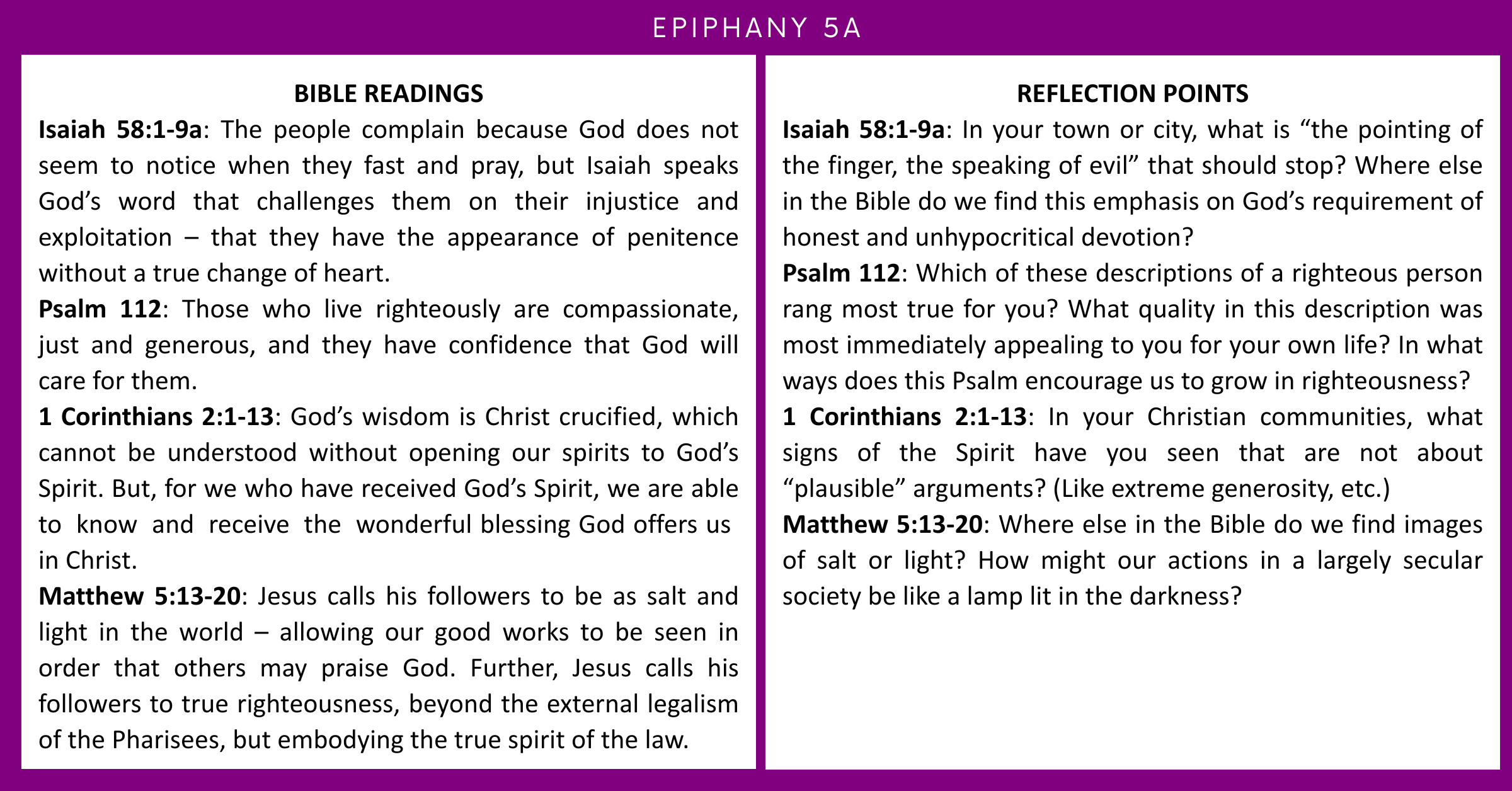 Epiphany5A 6 Feb Written By Tania Eichler Bible Readings and Reflections Isa 58:1-9a | Ps 112 | 1 Cor 2:1-13 | Matt 5:13-20Sunday 8 February 2025 Readings and Reflections Tania Eichler